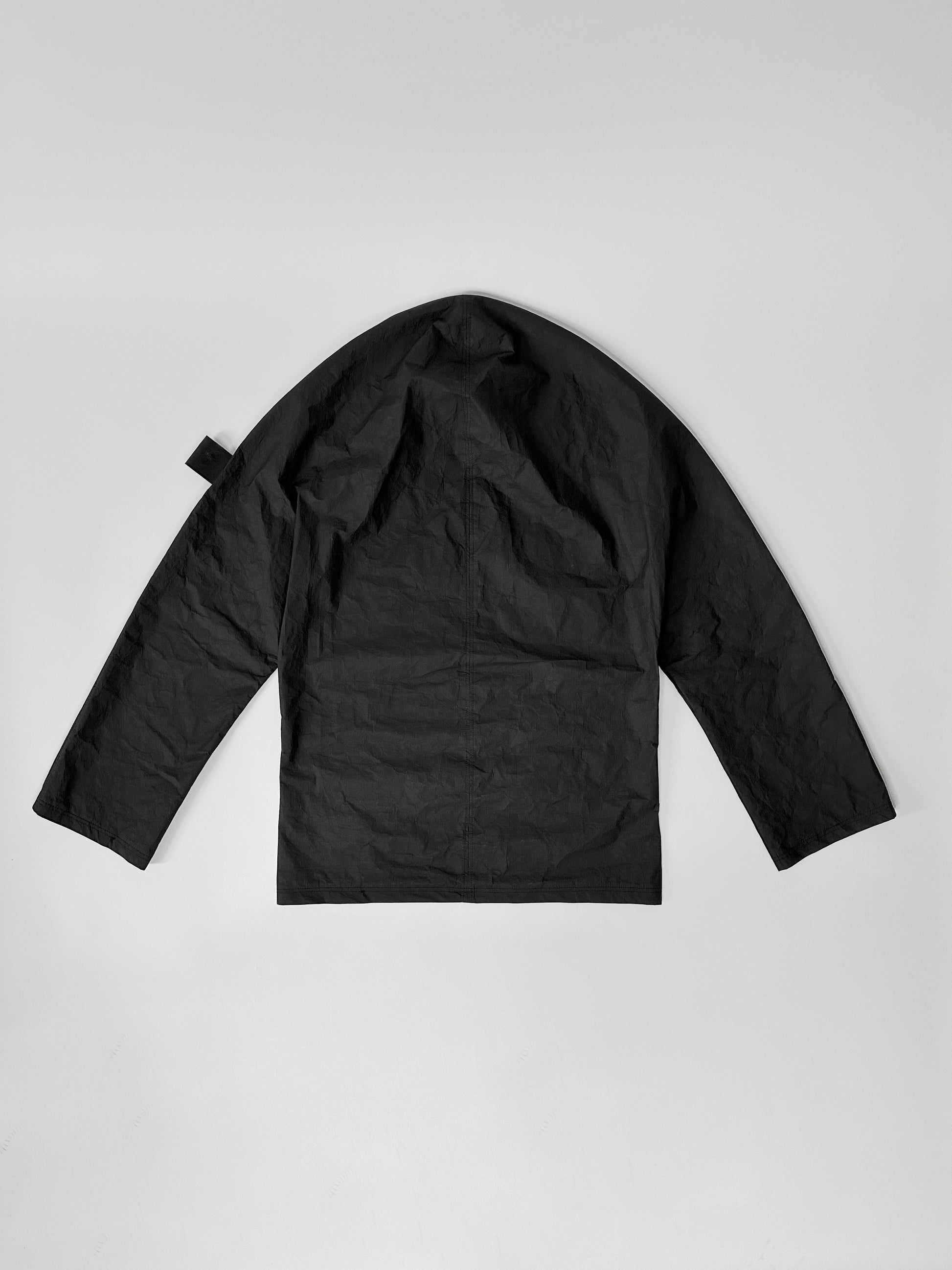 polyethylene, matte black (PU coated) — dry and sculptural, holding shape with sharp precision. as it wrinkles, it develops a unique, evolving texture. resistant to water, uv and heat.