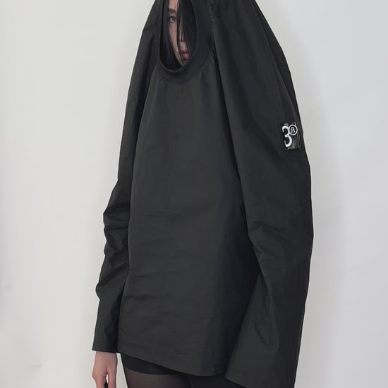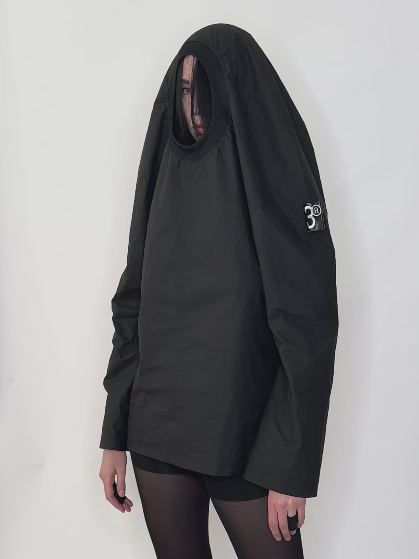 crafted by hand in our studio, this longsleeve explores the intersection of structure and adaptability. an extended back line folds forward to form a hood-like layer that frames the face through the neck opening, allowing the piece to shift between longsleeve and hooded form. the sleeves are long and fitted, contrasting with the fluid rear curve.