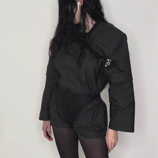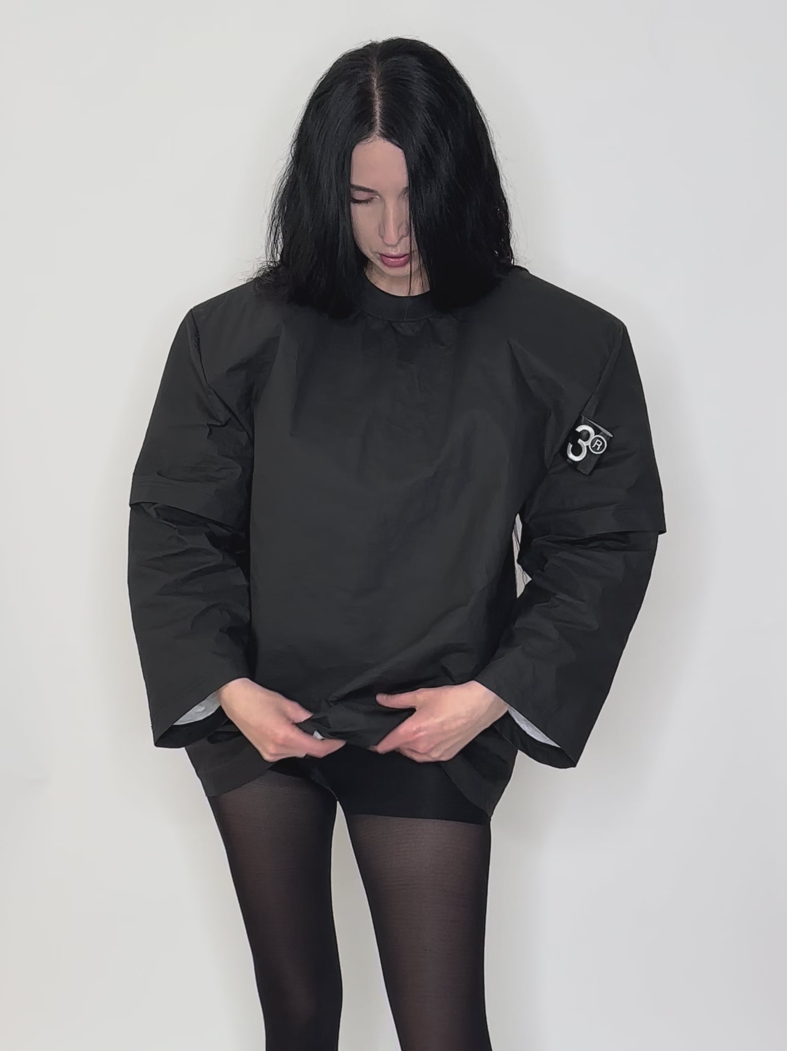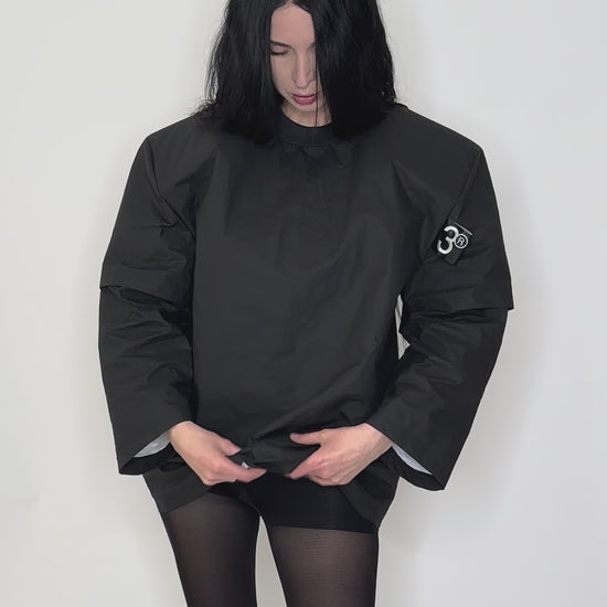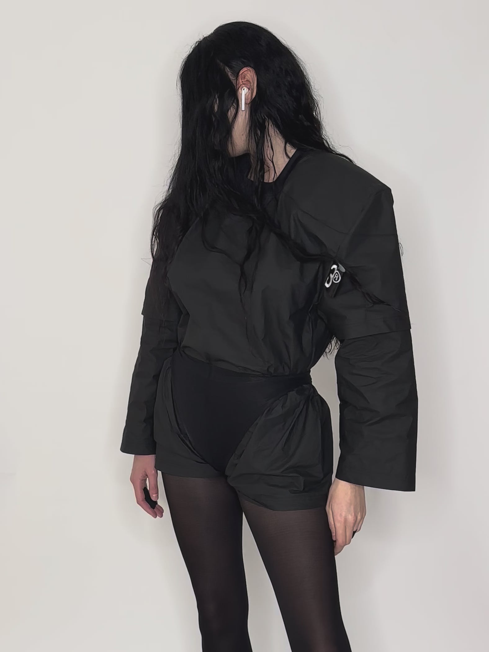 crafted by hand in our studio, this padded longsleeve revisits the 3R original t-shirt in a refined, extended silhouette. oversized shoulders, subtle padding and a double-sleeve construction — an inner short sleeve framed by a longer outer one — create a layered structure with quiet strength. the form is elongated, falling below the waistline for a relaxed yet deliberate proportion.